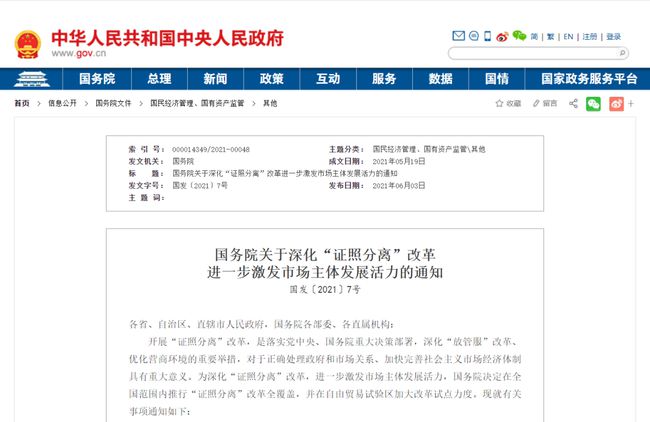 国务院日前印发《关于深化“证照分离”改革进一步激发市场主体发展活力的通知》(以下简称《通知》),部署自2021年7月1日起,在全国范围内实施涉企经营许可事项全覆盖清单管理,对所有涉企经营许可事项按照直接取消审批、审批改为备案、实行告知承诺、优化审批服务等四种方式分类推进审批制度改革。同时,要充分发挥信用监管基础性作用,建立企业信用与自然人信用挂钩机制,依法依规实施失信惩戒。